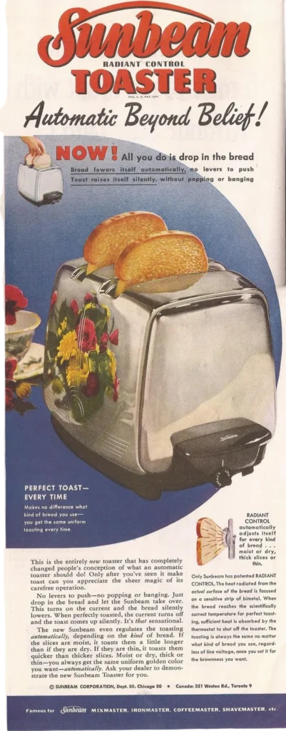 The toaster reflected broader cultural trends that were prevalent during the late 1940s, when technological advancements were rapidly changing various aspects of domestic life – families were becoming increasingly interested in gadgets that could make the process of home cooking not only faster but also more convenient. Sunbeam, already established as a reputable manufacturer of appliances, recognized this particular market opportunity and designed a product that went beyond the limitations of traditional single-function toasters.