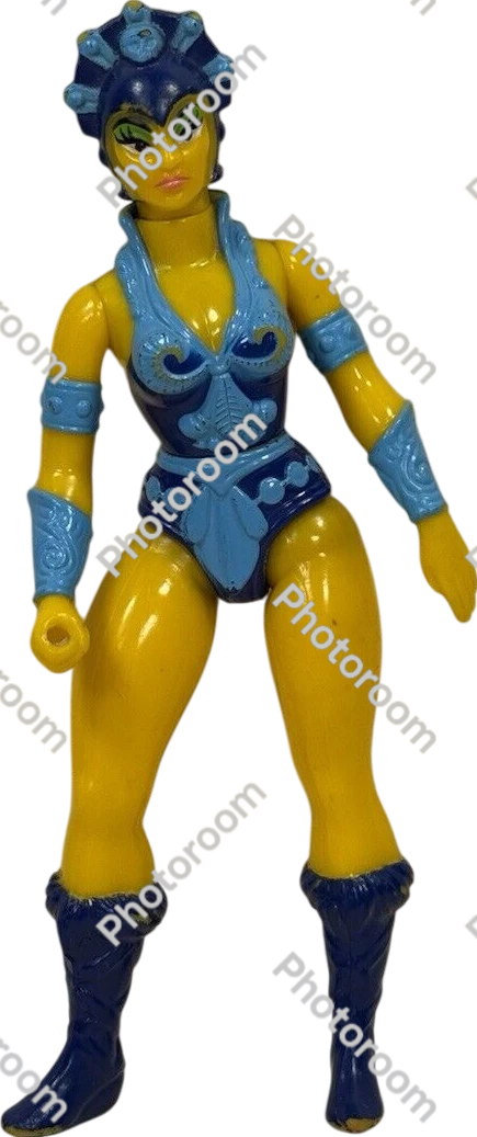 The figure represented an evil warrior-goddess who served as an essential and key lieutenant within Skeletor’s nefarious and malevolent forces, characterized prominently by her yellow skin tone and blue costume, which was essentially a 90% repaint of the Teela mold. She was included as part of the initial wave of action figures that would play a crucial role in helping to establish the Masters of the Universe franchise, which was originally conceived as a potential toy line based on Conan the Barbarian before it ultimately evolved into its own distinct and unique universe.