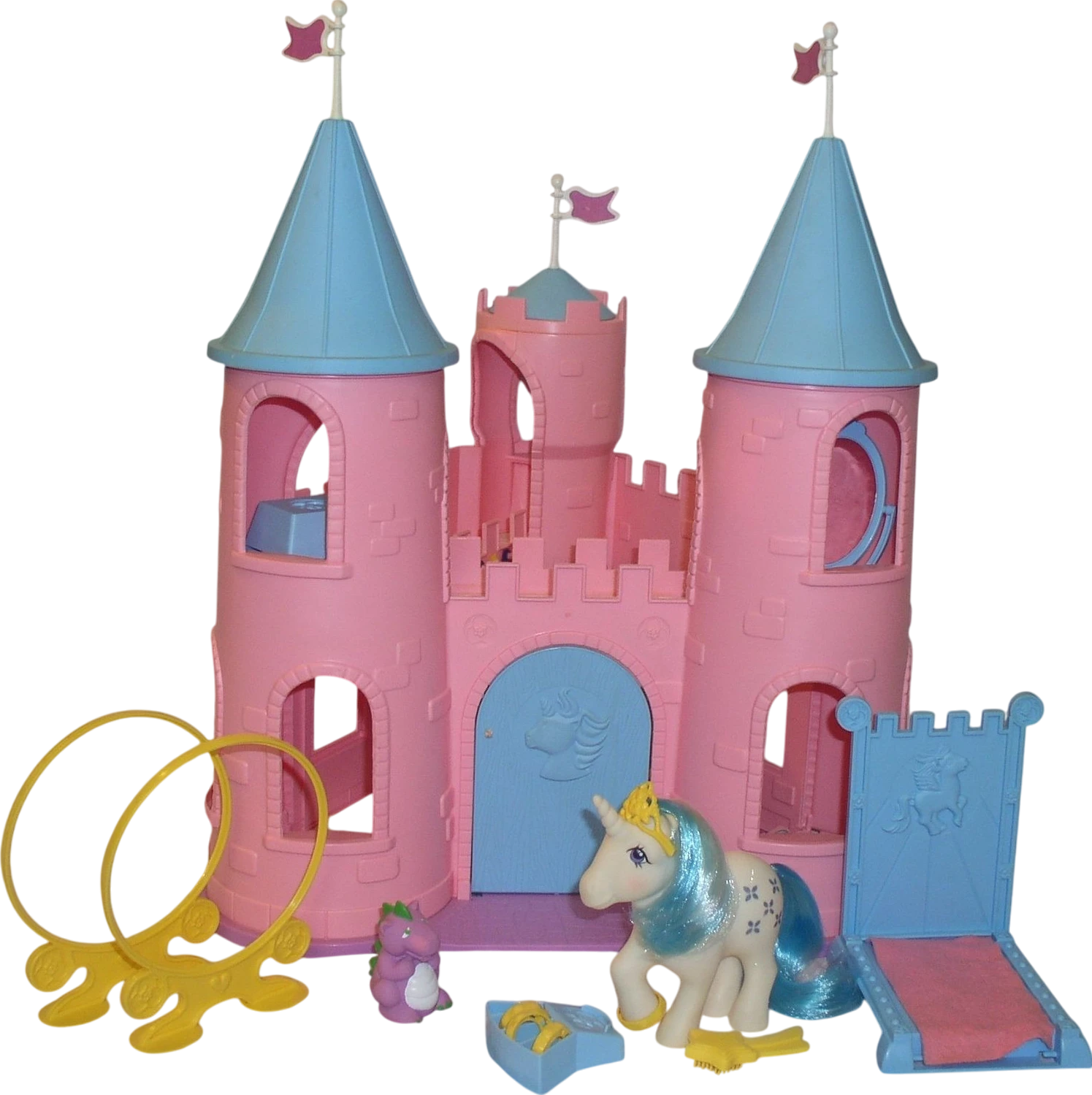 The Dream Castle came into existence during the Generation 1 (G1) era of My Little Pony toys, a period that spanned from 1981 to 1995. Originally introduced to the marketplace in 1983, the playset was an integral part of Hasbro’s expanding line of toys that followed the less successful My Pretty Pony collection. Bonnie Zacherle, who is recognized as the original designer, had envisioned creating toys that reflected her childhood desire to own a pony, which ultimately led to the thoughtful development of this iconic playset.