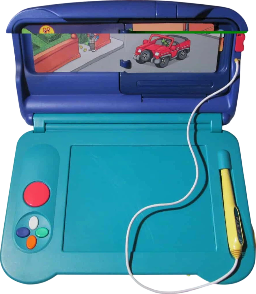 The hardware of the Pico ingeniously blended components from the Genesis with modifications that were friendly to children. A simplified controller layout replaced the standard D-pad with a large cluster of directional buttons, while a tethered plastic stylus—which was hardwired to the unit—detected pressure on a touch-sensitive drawing surface located beneath each storyware book. Cartridges that slot into the right side of the device contained 16-bit software that modified interactive prompts every time children flipped a physical page, syncing activities such as tracing letters or counting objects with engaging animations narrated by digitized voices. The technical specifications included: