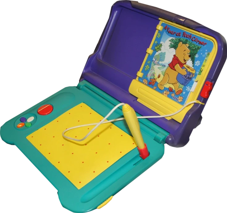 Today, complete Pico systems are relatively uncommon, yet they are not considered rare, typically priced between $50 and $150 depending on their condition and the bundled software included, while Japanese units along with storyware cartridges tend to surface more frequently due to the system’s longer lifespan in that region, with listings often including obscure titles such as Hello! Pac-Man or adaptations of Anpanman. North American releases—such as A Year at Pooh Corner or The Great Counting Caper with Mickey—command higher prices among collectors, particularly if the original book-style packaging remains intact, although functionality is not guaranteed given the age of the touchpad sensors and the wiring of the stylus.